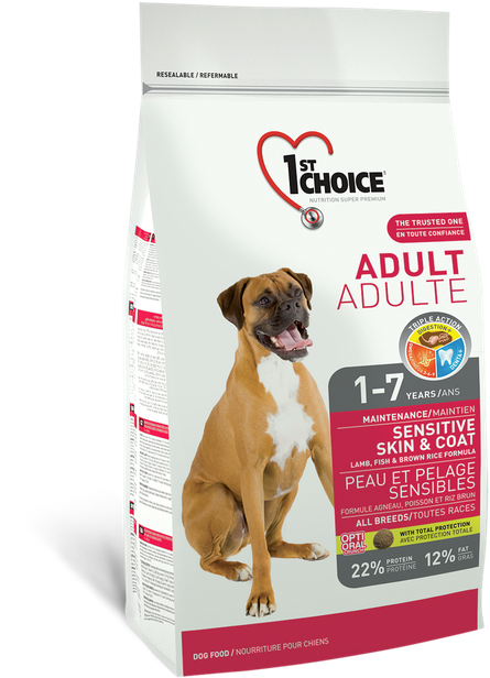 1STCHOICE ADULT ALL BREEDS LAMB - til sensitive voksne hunde kan du, med fordel fodre, med et foder der indeholder proteinkilder såsom lam og fisk.