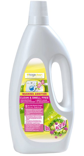 bogaclean® CLEAN & SMELL FREE WASHING ADDITIVE er et meget effektivt skyllesmiddel. Det eliminerer ubehagelige, organiske lugte dybt effektivt, mikrobiologisk og bæredygtigt.