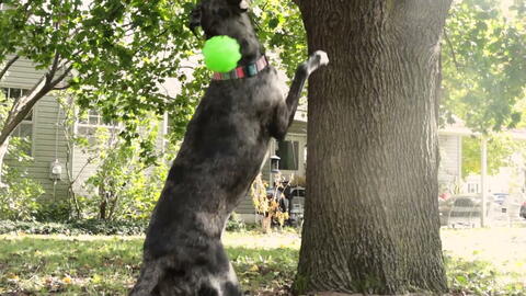 Jolly Tree Tugger er legetøj, som består af en Jolly Jumper ball, to sorte nylonsnore og en grøn ballistic nylon bungee.