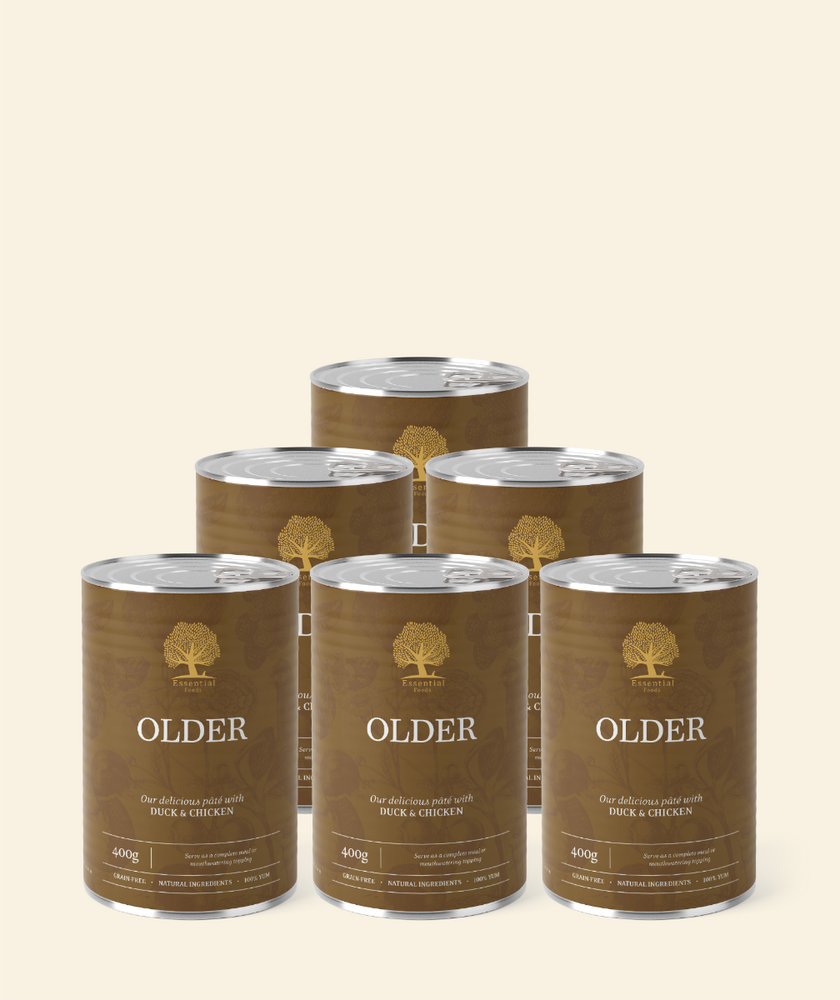 ESSENTIAL OLDER PÂTÉ er en lækker paté med kødstykker af and og kylling skræddersyet til ældre hundes behov. Et fuldfoder måltid eller en velsmagende topping som støtter en mild fordøjelse - noget seniorer ofte sætter ekstra pris på.