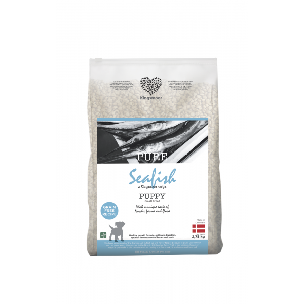 Kingsmoor Pure Small Seafish Puppy er hvalpefoder til små hunderacer med fisk, hvor Large er til mellemstore og store racer.