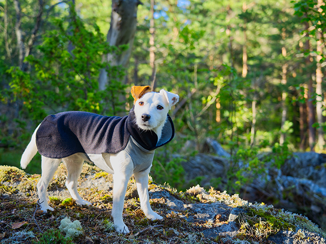 Dragten er lavet i et uld-mix, så hunden får de bedste egenskaber fra uld: varme, fugttransporterende og lugtabsorberende. Derudover er den en FIR membran, som er varmereflekterende.